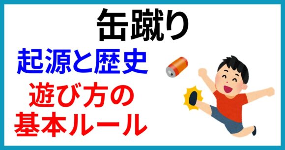 缶蹴りは、空き缶がひとつあれば、どこでもみんなで楽しめる日本の伝統的な遊びです。 昔から日本中で親しまれてきたこの遊びについて、その発祥と歴史、遊び方の基本ルールを分かりやすく解説します。 また、ポコペンとの違いについてもご紹介します。 缶... -