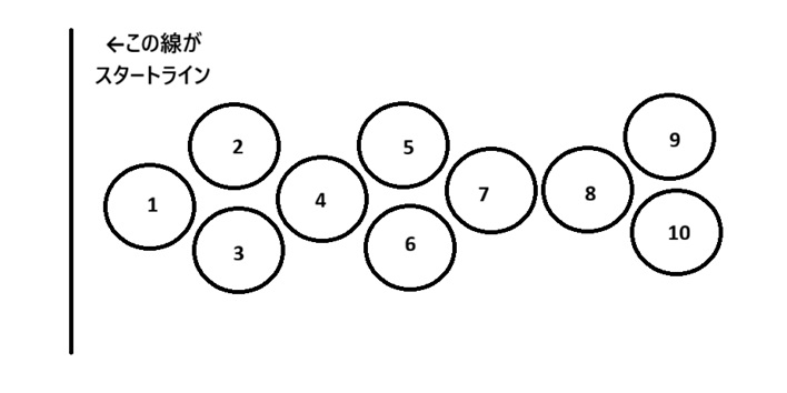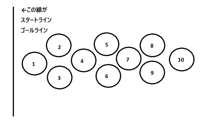 - 地面にスタートライン(ゴールライン)になる直線を引く(スタートラインとゴールラインは同じ)